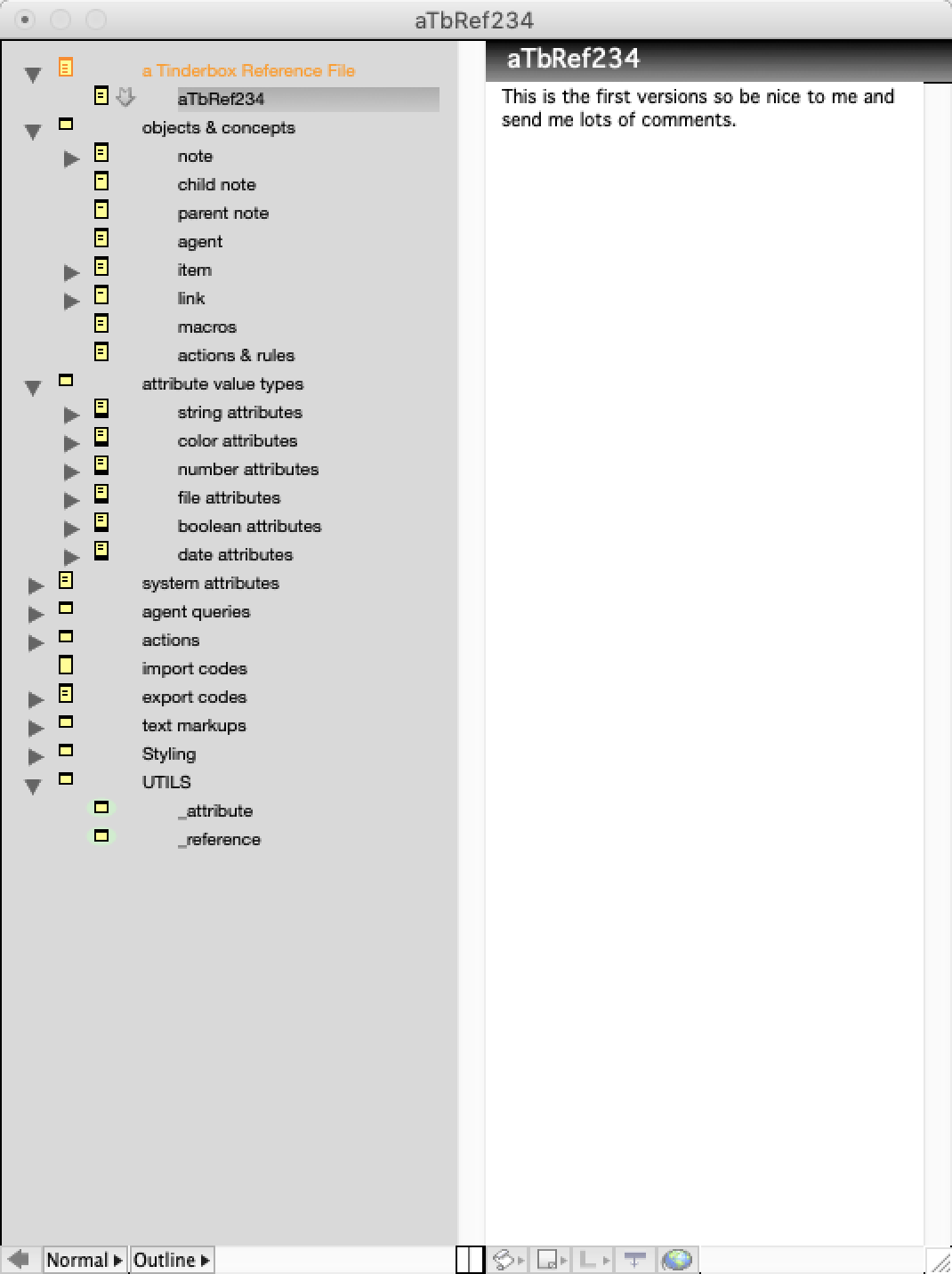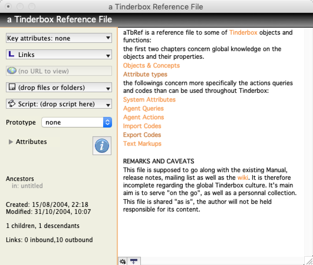 The first version of this document 'aTbRef.tbx' and associated website was written in April 2005 to reflect a baseline of Tinderbox v2.4 features and has been regularly updated to encompass all version changes since. The original baseline and subsequent versions online are listed here. The previous versions have, for the while, been left online at their original URLs above both to aid those using old versions and to honour the many inbound links. Web pages in the old versions have a header indicating the location of the (next) most recent site.